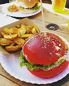 Burgers can also be made with patties made from ingredients other than beef.[39] For example, a turkey burger uses ground turkey meat, a chicken burger uses ground chicken meat. A buffalo burger uses ground meat from a bison, and an ostrich burger is made from ground seasoned ostrich meat. A deer burger uses ground venison from deer.[40]