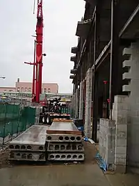 Hollow-core is a type of precast, prestressed concrete floor slab. It is often used in construction of multi-storey buildings. The advantages it has over cast-in-place concrete floor are that it is lighter in weight and often cheaper. Also, wet concrete needs to be pumped or carried up to higher floors. The slabs which are manufactured off site are simply lifted with a crane and set in place. Disadvantages are an increased overall floor thickness (due to the requirement of steel supporting beams), the cost of a steel frame over the cost of concrete columns and increased cranage requirements.