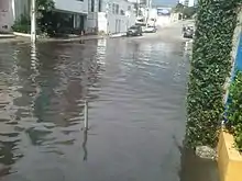 Urban flooding is the inundation of land or property in a built environment, particularly in more densely populated areas, caused by rainfall overwhelming the capacity of drainage systems, such as storm sewers. Although sometimes triggered by events such as flash flooding or snowmelt, urban flooding is a condition, characterized by its repetitive and systemic impacts on communities, that can happen regardless of whether or not affected communities are located within designated floodplains or near any body of water.[9] Aside from potential overflow of rivers and lakes, snowmelt, stormwater or water released from damaged water mains may accumulate on property and in public rights-of-way, seep through building walls and floors, or backup into buildings through sewer pipes, toilets and sinks.