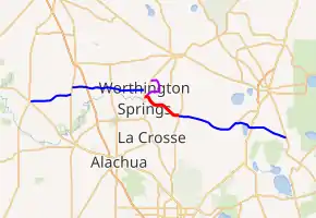 West of Worthington Springs, County Road 18 is a bi-county road that extends from US 27 (SR 20) in Fort White as County Road 18, also known as Southwest Fellowship Street along the O'Leno to Ichetucknee Trail.[2] The road takes a slight curve to the northeast that ends near the intersection of County Road 131 just south of that road's own intersection with CR 238. At the west end of the short concurrency with US 41/441 (SR 25) in Mikesville, CR 18 turns north, while the trail turns south towards O'Leno State Park. Once the concurrency ends, CR 18 turns east again at the intersection of Hammock Road, and becomes Southeast Sebring Street.