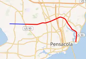 State Road 296 (SR 296) is a major thoroughfare in the Pensacola, Florida metropolitan area. It is an east–west route running roughly through midtown Pensacola and West Pensacola. Locally, it is known as Michigan Avenue, Beverly Parkway, Brent Lane, Bayou Boulevard, and Perry Avenue.[2] The western terminus of SR 296 is at U.S. Route 90 (US 90; Mobile Highway). Westward of this intersection, County Road 296 (Saufley Field Road) connects to State Road 173. The eastern terminus of State Road 296 is again at US 90, this time in eastern Pensacola, where it is known as Cervantes Street.
