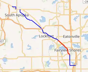 The road's historic terminus is an intersection with Plymouth Sorrento Road in Plymouth. The road has since been downgraded to a county road and bisected by State Road 414, the Apopka Expressway.[4] The current designation of County Road 424 (CR 424) begins at U.S. Route 441 in Apopka, is briefly interrupted by SR 414, and continues east to meet SR 424 and SR 434 on the Orlando city line.