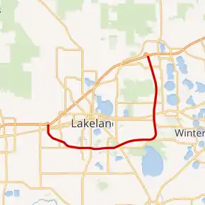 The Polk Parkway begins at Interstate 4 near the Hillsborough-Polk County line west of Lakeland.[5] Until reaching Harden Boulevard (exit 5), the Polk Parkway passes through mostly undeveloped land.[6] Just east of Airport Road (exit 3), the highway passes a large building with a green glass facade, which is the corporate headquarters for Publix Supermarkets.[7][8] Before reaching exit 4, the highway runs a half mile northeast of Lakeland Linder International Airport—a large general aviation airport—passing beneath the path of air traffic on Runway 5/23.[9] Between Harden Boulevard (exit 5) and South Florida Avenue (exit 7), the Polk Parkway was built along the alignment of Drane Field Road, which is now truncated at Harden Boulevard and continues to South Florida Avenue as frontage roads along the Polk Parkway. The first mainline toll plaza is located between South Florida Avenue and Lakeland Highlands Road.[5] The eastbound exit and westbound entrance at SR 540 (exit 14) are located at the Central Toll Plaza.[5][10] After crossing De Castro Road, the Polk Parkway curves to the north, passing the only operating landfill in Polk County.[11][12] Along the curve is the westbound exit and eastbound entrance of the SR 540 junction, which is the location of the planned interchange with the future Central Polk Parkway.[13] The Polk Parkway continues north for the remainder of its length.[5] A 4 mi (6.4 km) segment between Old Dixie Highway and Pace Road is a two-lane highway; the only overpass along this segment was built to accommodate a second carriageway west of the current highway.[14] About midway between Old Dixie Highway and Pace Road is the Eastern Toll Plaza.[5] The Pace Road interchange collects tolls with SunPass only and was added to the highway in 2011 to provide access to Florida Polytechnic University, located on the southwest corner of the I-4/Polk Parkway interchange.[5][15]