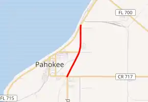 As motorists driving northbound on US 98/US 441/SR 15 veer to the west onto East Seventh Street and north onto Lake Avenue to go into downtown Pahokee, SR 729 continues alongside Florida East Coast Railroad tracks to the northeast and north through the outskirt farmlands of Pahokee, to reconnect with US 98/441/SR 15, which continues along the shore of Lake Okeechobee as Everglades Street.[3]
