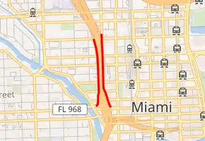 Mileage follows the northbound lanes. The southbound lanes are slightly shorter, at 0.506 miles (0.814 km) long. The entire route is in Miami, Miami-Dade County.