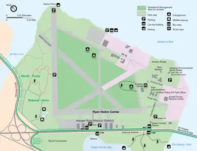 The section east of Flatbush Avenue, comprising the original airport, consists of the airfield's eight hangars, an administration building, and five runways.[214][202]: 3 [10] These structures have largely been preserved in their original state, as opposed to most municipal airports, which have been upgraded.[215] Two runways and two taxiways surround a large "field" that is crossed by the three other runways.[10] The North Forty Natural Area is located between the field to the south and the Belt Parkway to the north.[202]: 3 [10] The eastern coast is adjoined by Mill Basin Inlet to the north and Jamaica Bay to the east.[10] The Gateway Development Plan of 1979 divides the field in three areas. The "Natural Area", on the northern side of the field, was intended for ecological preservation. The "Developed Area", comprising the hangars and administration buildings on the western side of the field, was supposed to be for structural preservation and reuse. Finally, the "Administrative Area" was made up of the structures on the southern side of the field that were still in use by the Coast Guard, the Departments of the Interior and Transportation, and the New York Police Department.[191]