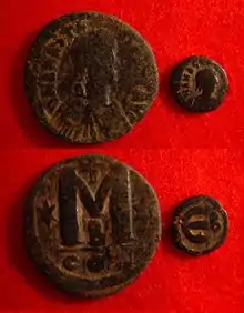 The follis was reintroduced as a large bronze coin (40 nummi) in 498, with the coinage reform of Anastasius, which included a series of bronze denominations with their values marked in Greek numerals. A 40 nummi coin of Anastasius is depicted on the obverse of the Macedonian 50 denars banknote, issued in 1996.[3]