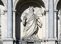 The iconography of the sculptures beneath the arches mingles a biblical and political motifs. The central arch featured a large statue of Moses, made in 1588 by Leonardo Sormani and Prospero da Brescia. The pope, as both religious and political ruler of the papal states, would have felt an affinity to Moses. The left bas-relief panel, sometimes referred to as a depiction of Aaron, and sculpted by Giovanni Battista della Porta,[6] may instead reflect either the miracles by Moses at Marah, where Moses removed the bitterness of the barely potable water of a spring in Sinai, or more likely the miracle at Masah and Meribah, where he struck the rock to cause water to flow (Exodus 17:5-7). Again, the pope would have wanted his achievement of bringing water to Rome to be compared to that of Moses. Finally, the bas-relief to the right sculpted by Flaminio Vacca and Pietro Paolo Olivieri, has been depicted as Joshua, but others claim the relief references Gideon in Judges 7:5, as evidenced by soldier's gear and animals lapping water.[7][8][9] Alternatively, given the Roman attire of the soldiers, it may reflect the founding of the ancient Roman Acqua Alessandrina by emperor Septimus Severus; the imagery would lead to having the feat of the aqueduct being compared to the achievements of ancient Rome, or as an example of the restoration of the former glory of the city. Water flows from the statues into basins, where four lions, originally Ancient Egyptian sculptures, but now copies, once were part of a monumental fountain dedicated to Marcus Agrippa in front of the Roman Pantheon, are spouting water. The columns flanking the arches are also said to have derived from that structure.[10]