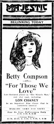 For Those We Love is a 1921 American silent romantic drama film produced by and starring Betty Compson and Lon Chaney. Directed by Arthur Rosson, the film was distributed by Goldwyn Pictures.[1][2] It is now considered to be a lost film.[3]
