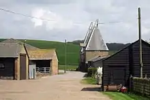 In 1647, during the English Civil War, Ford was surveyed on behalf of Parliament, which had acquired it from the Church of England, and found to be in reasonable repair.[58][59] The whole estate was said to be worth a rent of £43.10s. (£43.50), and the value of the materials of all the buildings was put at £820, were they "to be sold ... and taken away".[59] The palace was largely demolished by order of Parliament in 1658, while the see of Canterbury was vacant, and the materials were sold for £840.[60] The estate was returned to the see after the Restoration of 1660, and a report made in 1661 states that "Ford pallace is so much ruonated as if the author therein did count it merit to make such destruction; the mannor house [is] totaly cast down [and] the Chapell made a barne".[61] In 1667 the original barn and the gatehouse were reported as dilapidated, and in 1668 it was reported that the tenant of the remainder of the estate, not including the barn and gatehouse, had continued the demolition and sold "six or seven loads of the best stone".[62][Fn 8] At about the same time tiles were sold from Ford to the churchwardens of nearby Herne.[62] Although the remains of the palace continued to be quarried for materials or adapted, parts of the palace hall and chapel stood until 1964, when they were demolished in preparation for a new farm building.[63][Fn 9]