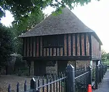 Elements of the building, which was designed in the Tudor style using timber frame construction, date back to the early 15th century and an earlier building on the site was repaired in 1474.[1] Records indicate that it was then substantially rebuilt in brick, rubble and stone in around 1544.[2][3][4] The design involved a symmetrical main frontage facing south parallel with King Street. On the ground floor, which was built in a mixture of red brick and rubble, there were two wooden doors to the left and right of centre. On the first floor, which was jettied out over the ground floor and finished in herringbone brickwork interspersed with a series of vertical posts, there was a central four-light casement window.[1] Internally, the ground floor was used as a prison for petty criminals and the first floor was used as a courtroom.[1]