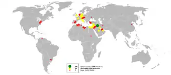 Since the outbreak of the Syrian Civil War, the Syrian economy has been hit by massive economic sanctions restricting trade with the Arab League,[24] Australia,[25] Canada,[26] the European Union,[27] (as well as the European countries of Albania,[28] Iceland,[28] Liechtenstein,[28] Moldova,[28] Montenegro,[28] North Macedonia,[28] Norway,[29] Serbia,[28] and Switzerland)[30] Georgia,[28] Japan,[31] South Korea,[32] Taiwan,[33] Turkey,[34] and the United States.[35] Sanctions against Syria were further extended by the US Caesar Syria Civilian Protection Act that came into force in June 2020.