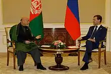 Russia sharply criticised the NATO-led military intervention in the Libyan civil war, though it chose not to use its veto power on the United Nations Security Council to block it. On 27 May 2011, Russian President Dmitri Medvedev said that although Moscow opposed the military operations, it believed Gaddafi should leave power.[75] In early June 2011, Russian envoy Mikhail Margelov was received in Benghazi, the de facto headquarters of the Libyan opposition. Margelov's stated objective was to broker a truce between anti-Gaddafi forces and the Gaddafi-led government.[76] He left Benghazi with an invitation from the NTC for Russia to open a representative office in the city,[77] though it opted not to do so before recognising the council as Libya's sole legitimate representative, which it did on 1 September 2011.[78] | ||