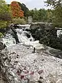 ![]() The mill around 1900, looking north up the Royal River. Factory Island is on the right | |