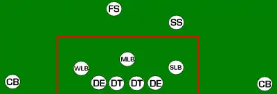 This formation assumes the offense is lined up strong side right (from the offense's point of view). This diagram could be matched up to an offensive formation diagram to make a complete 22 player football field.