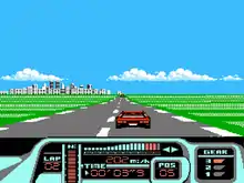 Races start out as single-lap events but become double-lap events as the player starts racing against more experienced competition in places like Las Vegas, Nevada and Hawaii.[5] With gameplay similar to Rad Racer and Pole Position, the driver races towards the back of the screen.[6]
