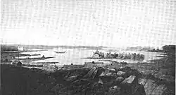 The settlement at Fort Drummond contained military structures as well as private houses. The settlement was centered around a parade ground fronting on the west side of the bay. Military barracks and commissary were located on the west side of the parade ground, and officer's quarters were haphazardly placed in the area. A "boulevard" ran along northward from the parade ground a good 2,000 feet (610 m), while a military road continued southward of the parade ground to the shore.[12] The section of land east of the boulevard, between the boulevard and the bay, was reserved for gardens, while houses were built on the west side of the boulevard. The boulevard was lined by a row of poplar trees on each side.[13]