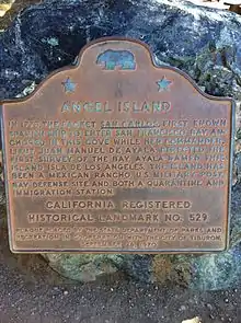 Angel Island is an island in San Francisco Bay. The entire island is included within Angel Island State Park, administered by California State Parks.[2] The island, a California Historical Landmark,[1] has been used by humans for a variety of purposes, including seasonal hunting and gathering by indigenous peoples, water and timber supply for European ships, ranching by Mexicans, United States military installations, a United States Public Health Service Quarantine Station, and a U.S. Bureau of Immigration inspection and detention facility.[3] The Angel Island Immigration Station, on the northeast corner of the island, which has been designated a National Historic Landmark, was where officials detained, inspected, and examined approximately one million immigrants, who primarily came from Asia.[4] Under the Chinese Exclusion Act of 1882, the first United States law to restrict a group of immigrants based on their race, nationality, and class, all arriving Chinese immigrants were to be examined by immigration or customs agents.[5]