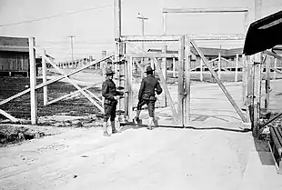 The Swiss Embassy represented the German interests and the Swedish Embassy represented those of the Austrians. Some of the prisoners performed hard labor on the roads and in the quarry. They were ordered to sign a document that they were doing so of their own free will. Many refused to sign and were locked in a separate camp behind barbed wire. Protests to the Swiss Consul, Dr. Huebscher, were ineffectual; but the Swedish Count Rosen, who represented the Austrian prisoners, was able to reverse the decision, "and the prisoners were returned to the main camp and put back on full rations."[11] Otherwise, the treatment of the prisoners was generally fair ("not that we were badly treated") but the prisoners suffered from two major irritants. Letters and cards were heavily censored, and the prisoners suffered "from the unbearable uncertainty as to the duration of our detention."[8] However, 2,000 German prisoners and 1,600 civilian internees who opted for repatriation were returned to Germany and Europe in June or July 1919.[12]