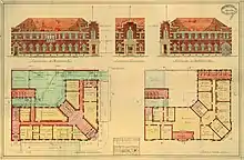 The main corner entrance portico opens to a spacious main entrance lobby and hall around which the building hinges and from which central corridors run through each wing. Within the hinge, a dog leg timber stair connects to the first floor and a rear entrance opens to the courtyard beyond. The corridor to the Brookes Street wing opens to the vehicle laneway and the corridor to the Wickham Street wing terminates at a secondary dog leg timber stair. A side passage off this corridor connects via a battened gangway to the lavatory block in the rear courtyard.[1]