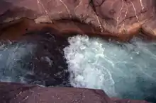 Fossil Springs, the source of about 80 percent of the water in Fossil Creek, issues from several vents in close proximity to one another at the base of the Mogollon Rim.[10] The rim is the southern edge of the Colorado Plateau. Water percolating through limestone layers in the rim becomes laden with dissolved carbon dioxide and calcium carbonate.[10] When the water emerges at the springs, it begins to release carbon dioxide as a gas and calcium carbonate as travertine, a porous form of calcite often found around hot springs such as Mammoth Hot Springs in Yellowstone National Park.[11] The release, affected by stream turbulence and other factors, does not occur all at once but continues downstream.[10]