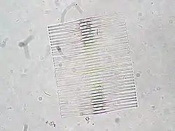 Fragilaria is a genus of freshwater and saltwater diatoms. It is usually a colonial diatom, forming filaments of cells mechanically joined by protrusions on the face and in the center of their valves. The individual diatoms appear swollen in their centers where they are joined to the colonial ribbon.[1] the genus grows as both plankton and benthic species, free living in colonies or epiphytic. Some species are bloom forming diatoms in eutrophic lakes. The type species is Fragilaria pectinalis Lyngbye from designating a lectotype from Conferva pectinalis O.F.Müller.[2] The taxonomy of the genus is still uncertain.[3]