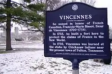 On 25 March 1736, Vincennes was burned by the Chickasaw Indians along with other captive French at the village of Ogoula Tchetoka, near the present site of Fulton, Mississippi,[5][6] although the historical marker in Vincennes (pictured in this article) gives the location as Fulton, Tennessee. They were captured as the result of ill-advised raids in coordination with Pierre D'Artaguiette. The raids are now known as the Chickasaw Campaign of 1736 of the Chickasaw Wars.[7]