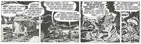 Beginning with the strip for April 8, 1985, Matera began his two-decade run drawing Steve Roper and Mike Nomad, which had been titled simply Steve Roper from 1947 to 1969. The series originated as the comedy strip Big Chief Wahoo in 1936, but supporting character Steve Roper edged into the title in 1944, with the dramatic adventure renamed Chief Wahoo and Steve Roper. Wahoo was written out in 1947, and Nomad was added in 1956. Matera additionally wrote the final year of Steve Roper and Mike Nomad, following writer John Saunders' death in November 2003. The final strip ran December 26, 2004.[7][8]