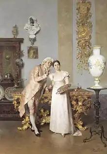 Francesco Beda (Trieste, 29 November 1840 – 30 July 1900) was an Italian painter, mainly depicted costume genre subjects. The "costume genre subjects" were popular with some buyers, and depicted individuals in anachronistic, often aristocratic garb of the prior centuries, often entertained in either gallantry or frivolous enjoyment.[1]
