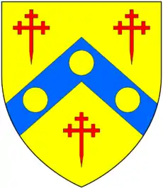 Arms of Crossing of Exeter: Or, on a chevron azure between three crosses crosslet fitchée gules as many bezants[1]