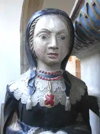 Anne Dudley, wife of Sir Francis Popham, detail of her kneeling effigy in Wellington Church, at east end of 1607 monument to her father-in-law Sir John Popham