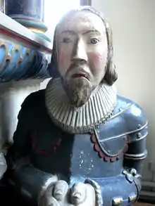 Sir Francis Popham shown as a young man aged 34, kneeling effigy in Wellington Church, Somerset, at east end of 1607 monument to his father Sir John Popham (1531–1607), Lord Chief Justice of England