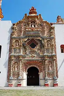 The Santiago mission in Jalpan was established before the arrival of Junípero Serra in 1744, but Serra was in charge of building the mission complex that stands today from 1751 to 1758, the first to be built. It is dedicated to James the Greater, the first evangelist.[5][11] This complex is situated in the center of the modern town in front of the main plaza and formed by an atrium, cloister, pilgrim portal and church, with a chapel annex on the left side. The original atrium wall was lost, but reconstructed in the same style, with three portals and inverted arches.[3] The main features of the ornate portal on the facade are Our Lady of the Pillar and the Virgin of Guadalupe, both with Mesoamerican connections, as well as a double headed eagle, meant to symbolize the blending of the two cultures.[5]