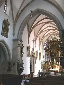 Small basilican triple nave is vaulted by four serveries of cross vault. Ogee moulded vaulting ribs are led into simple geometric console with polygonal cover. Eastern triple nave is ended by triumphal arch situated on ogee moulded semi-pillars.[3] The nave is separated from its aisles by monumental cylindrical non profiled posts carrying Gothic arcade. The arcade is carrying smooth wall with small double windows which consist of different types of traceries, that illuminate the nave. South aisle is directly connected to monastic cloister. From the north aisle is possible to access the chapel of St. Anthony with octagonal plan.