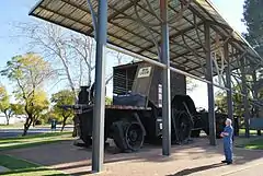 Big Lizzie stood idle for many years. The Blackstone engine was sold in 1938, powered stone crushing equipment at Pyramid Hill until 1942 and was scrapped in 1945.[9] Big Lizzie was recovered and brought to Red Cliffs in 1971. She is now displayed in Barclay Square on the Calder highway. Visitors may listen to a recording that tells the history of the machine.[10]