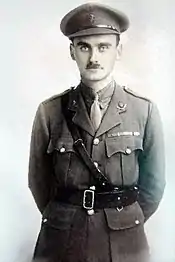 Roberts, promoted to lieutenant on 3 September 1914,[4] along with his battalion, then commanded by Lieutenant Colonel George Grogan, returned to the United Kingdom shortly after the declaration of war and arrived there in October 1914, where it became part of the 24th Brigade of the 8th Division, which was then in the process of formation.[3] The battalion was sent to reinforce the British Expeditionary Force (BEF) on the Western Front and landed in France in November 1914. The battalion was involved in the winter operations 1914–1915 and participated in the Christmas truce, although it is not known if Robets himself took part.[3][5] Three months after his arrival, Roberts was awarded the Distinguished Service Order while leading a trench raid.[1] He was made his battalion's adjutant and fought in the Battle of Neuve Chapelle, and was promoted to captain on 6 August 1915[6] He remained as adjutant until October 1916 when he was made a brigade major of the 8th Division's 23rd Brigade. In this capacity, during the Battle of Passchendaele (also known as the Third Battle of Ypres) in August 1917, Roberts was awarded the Military Cross (MC).[7] On 24 October 1917 he returned to the 1st Battalion, Worcesters and, aged just twenty-six, was promoted to the acting rank of lieutenant-colonel,[8] and given temporary command of the battalion, becoming one of the British Army's youngest battalion commanders.[3]