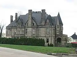The mansion was built in 1891 for the Buhl family, which owned the Sharon Iron Works. The ashlar sandstone residence has 2+1⁄2 storeys. Noted Youngstown architect Charles Owsley (1846–1935) designed it in the Richardsonian Romanesque style. The mansion features round arches, steep gable wall dormers, an inset porch with heavy arches, stone finials, and several turrets with copper capped spires. Although the house had been converted to apartments, it was restored. It currently operates as a bed and breakfast as well as a wedding venue.[2][3][4]
