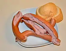 A Frankfurter (German for Frankfurt sausage) is a thin parboiled sausage made of pure pork in a casing of sheep's intestine. The taste is acquired by a method of low temperature smoking. For consumption, occasionally Frankfurters are not cooked; they are heated in hot water for only about eight minutes to prevent the skin from bursting. From time to time they are cooked on a propane or charcoal grill. They are traditionally served with bread, mustard, horseradish and/or potato salad.