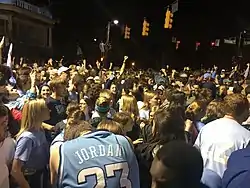 - Victory celebrations: While students previously held "Beat Duke" parades on Franklin Street before sporting events,[13] today students and sports fans have been known to spill out of bars and dormitories upon the victory of one of Carolina's sports teams.[14] In most cases, a Franklin Street "bonfire" celebration is due to a victory by the men's basketball team,[15][16] usually over Duke with Blue Devils gear as the fuel, although other Franklin Street celebrations have stemmed from wins by the women's basketball team and women's soccer team. Upon the event the men's basketball team reaches the national championship game, local stores are known to halt sales of Carolina-blue paint to avoid a repeat of the 1982 jamboree which resulted in Franklin Street being painted blue by celebrating fans. On April 6, 2009 after winning the men's basketball national championship, over 45,000 UNC fans and students crowded Franklin Street. And on April 3, 2017, more than 55,000 fans rushed Franklin Street to celebrate another men's basketball national title.