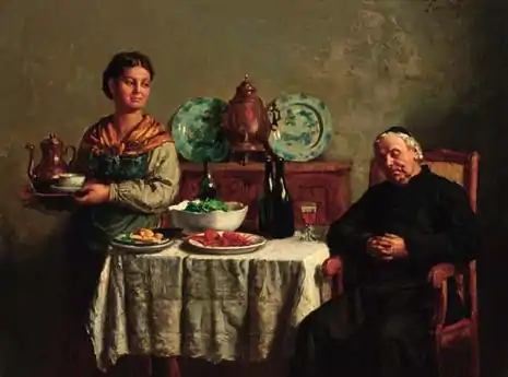 His genre scenes often depicted Catholic clergy and notaries in their offices. These works are characterised by their humorous or sentimental touch and their pleasant colors.[2]