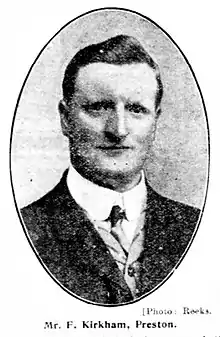 Kirkham was a well-known domestic referee who also had a job as a commercial traveller. He took charge of the 1906 FA Cup Final.[1] He had also taken charge of 11 "A" International matches between 1903 and 1907, including Wales vs. Scotland on 9 March 1903,[2] and was considered in the top three of world referees.[3] Other Scotland matches he refereed were against Ireland on 26 March 1904[4] and Wales on 6 March 1905[5]