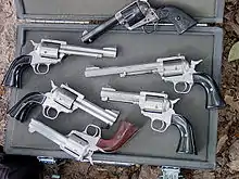 A number of variants upon the Model 83 have been produced, all with five-shot cylinders. The first was a .45 Colt in February 1986 (54 examples sold 1986–1989, serial numbers E7201-E7254), followed closely by a .44 Magnum version.[5] In 1991, Freedom Arms introduced the Model 252 in .22 long rifle and in 1992 the model 353 in .357 Magnum, including a 9-inch variation produced to meet the 4lb maximum weight requirement for IHMSA Silhouette competition. In 1993 the Model 555 was introduced in .50 Action Express. .41 Magnum and .475 Linebaugh chamberings were introduced in 1997 and 1999 respectively.[1][6] Freedom Arms introduced their own .500 Wyoming Express in the Model 83 .500 WE in 2005.[7]