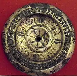 There are seven pieces in the British Museum and 68 pieces in the Yorkshire Museum which, together, probably constituted the original hoard.[2] These are all harness fittings (horse gear) - decorative elements used on reigns and other straps. A further 28 objects in the Yorkshire Museum are associated with the hoard, but were considered by Graham Webster as not belonging to it - these include a scabbard mount, a chape, terret rings, studs, and other mounts.