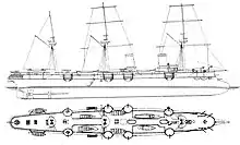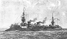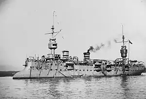 Alger was sent with the protected cruiser Isly on a cruise to French Indochina, departing in October 1895.[5][8] She remained on station in the Far East in 1896,[9] and returned to France in February 1897.[5] After arriving home, she was assigned to the Mediterranean Squadron for the annual maneuvers that were conducted in July.[10] That year, while in Toulon, the ship had her masts replaced.[4] Alger had been deactivated and placed in the reserve fleet by January 1901.[11] During this period, the ship underwent additional refits.[4] The ship's activities in the mid-1900s are unclear; Thomas Brassey's The Naval Annual lists Alger among the vessels that took part in the fleet maneuvers in 1906, which began on 6 July with the concentration of the Northern and Mediterranean Squadrons in Algiers. The maneuvers were conducted in the western Mediterranean, alternating between ports in French North Africa and Toulon and Marseilles, France, and concluding on 4 August.[12] But according to the historians John Jordan and Philippe Caresse, Alger had been reactivated in 1905 for another deployment to the Far East, along with the armored cruisers Bruix and Dupetit-Thouars, the protected cruiser Guichen, four gunboats, and five destroyers.[13]