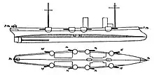 The ship's propulsion system consisted of a pair of 3-cylinder triple-expansion steam engines driving two screw propellers. Steam was provided by twenty-four coal-burning Belleville-type water-tube boilers that were ducted into two funnels. Her machinery was rated to produce 8,200 indicated horsepower (6,100 kW) for a top speed of 19 knots (35 km/h; 22 mph), but on her initial speed trials, her engines reached 19.61 knots (36.32 km/h; 22.57 mph) from 7,928 ihp (5,912 kW). She had a cruising radius of 6,440 nautical miles (11,930 km; 7,410 mi) at 10 knots (19 km/h; 12 mph).[2][4]