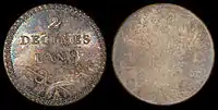 Coinage with explicit denominations in decimal fractions of the franc also began in 1795.[12] Decimalization of the franc was mandated by an act of 7 April 1795, which also dealt with the decimalization of weights and measures. France led the world in adopting the metric system and it was the second country to convert from a non-decimal to a decimal currency, following Russia's conversion in 1704,[13] and the third country to adopt a decimal coinage, also following the United States in 1787.[14] France's first decimal coinage used allegorical figures symbolizing revolutionary principles, like the coinage designs the United States had adopted in 1793.