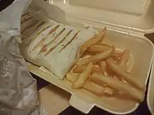 A French tacos[note 1] (French: tacos français [takos fʁɑ̃sɛ] or simply tacos[note 2]) also known as Lyon tacos (French: tacos lyonnais [takos ljɔnɛ]) or matelas[1] (French for "mattress") is a fast food dish which usually consists of a flour tortilla grilled and folded around a filling of French fries, cheese, and meat, among other deli ingredients. More similar to a burrito than to a taco, and claiming inspiration from Mexican cuisine, it originated from the region of Rhône-Alpes in France in the early 2000s, before becoming popular among teenagers and young adults in all of France and abroad.