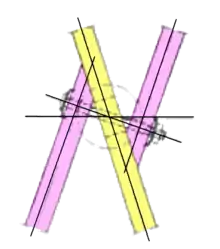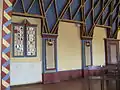 In the Zollinger construction system, short planks are arranged in such a way that two planks meet in the middle of a vertically running plank. A typical connection details consists of a bolt that goes through a slotted hole in the middle plank, with toothed washers being placed between the planks. Typical dimensions for the planks used in roofs constructed in the interwar period are 3 cm × 20 cm, with lengths between 2 and 2.5 m.[6][7]