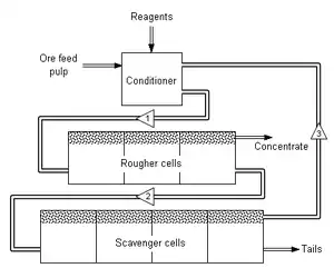 Simple flotation circuit for mineral concentration. Numbered triangles show direction of stream flow. Various flotation reagents are added to a mixture of ore and water (called pulp) in a conditioning tank. The flow rate and tank size are designed to give the minerals enough time to be activated. The conditioner pulp [1] is fed to a bank of rougher cells which remove most of the desired minerals as a concentrate. The rougher pulp [2] passes to a bank of scavenger cells where additional reagents may be added. The scavenger cell froth [3] is usually returned to the rougher cells for additional treatment, but in some cases may be sent to special cleaner cells. The scavenger pulp is usually barren enough to be discarded as tails. More complex flotation circuits have several sets of cleaner and re-cleaner cells, and intermediate re-grinding of pulp or concentrate.