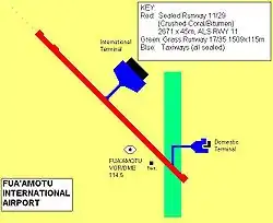 The air field was constructed by Seabees of the 1st Construction Battalion with assistance and labor of the U. S. Army 147th Infantry Regiment.[3] It was intended as a World War II heavy bomber field, and had three coral-surfaced runways. In the late 1970s, it was expanded to permit jet aircraft to use the runways. Fuaʻamotu is now suitable for up to Boeing 767 size aircraft, but remains closed to larger jets (e.g. Boeing 747s).
